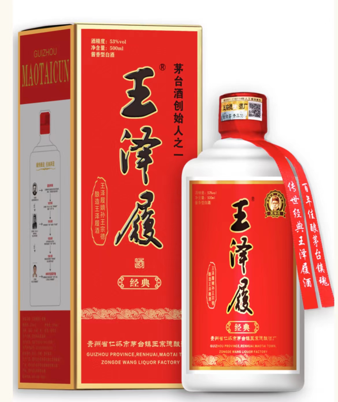 品 名: 王泽履 经典红 原 料: 高粱、小麦、水 香 型: 酱香型 执行标准: GB/T26760-2011(优级) 酒精度: 53%vol 净含量: 500ml/瓶 酒 体: 5年基酒(85%)...